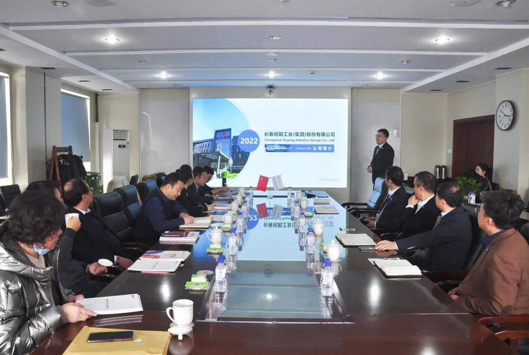 参观结束后,调研组与旭阳集团总经理冯浩、党委书记高剑飞、副总经理赵洪军、商务总监李一斌、长春市汽车零部件制造业商会秘书处主任孙洪刚等进行了座谈。李一斌首先就旭阳集团现状及旭阳中法智能产业园建设等情况做了详细介绍。