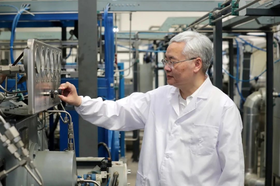 陈学东院士在氢能实验室调试自主研发的国内首套氢气循环疲劳测试系统